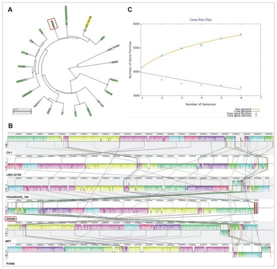 The phylogenic relationships among the compared strains were additionally visualized via pan- and core-genome analyses. Similarly, as in the initial phylogeny analysis results, the pan-genome analysis clustered SRS89 in a separate clade at a long distance to C9-1, while the core-genome-based analysis clustered SRS89 as genetically more like MP7 and LMG24199 (Figure 4). A relatively large pan-genome-based distance was observed between SRS89 and FDAARGOS_160, which were clustered in a direct vicinity in genome-based analysis.