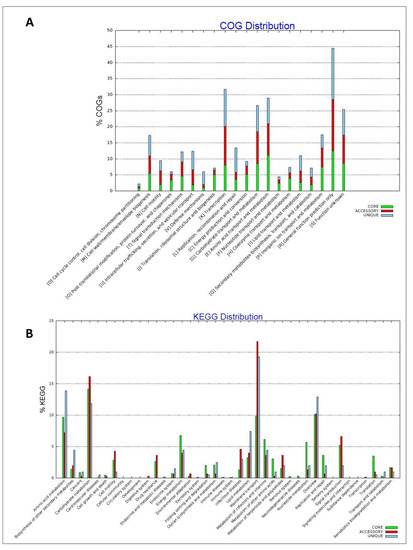 Functional analysis of a pan- and core-genome showed that the highest number of genes within the analyzed genomes were engaged in transcription, amino acid transport and metabolism, and carbohydrate transport and metabolism (Figure 3A), with a significant number of genes related to COG involved in membrane transport (Figure 3B).
