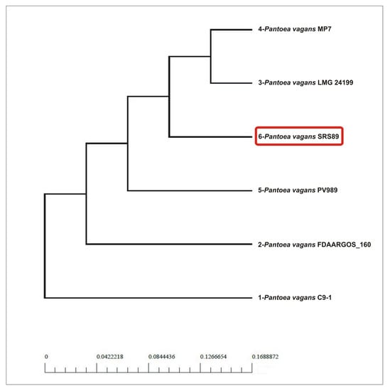 Genomic DNA obtained from the endophytic bacteria was used for WGS. Sequence libraries were prepared using the Nextera XT v2 library preparation kit and sequenced on a MiSeq desktop sequencer (Illumina, San Diego, CA, USA) using MiSeq V3 reagent kits. The library was sequenced in a 300 bp paired-end run to obtain 404,752 reads. Raw reads were processed using Trimmomatic software [100] to remove adapter sequences (only keeping reads longer than 30 bp after timing) and filtered for quality to remove reads of a quality lower than Q20. Additionally, only reads with pairs after filtering were retained for further analysis. This resulted in 344,414 300-bp reads that were used for genome assembly. The initial assembly was created using Unicycler [101] software and the SPAdes algorithm [102] with an error correction step, in Pilon [103] for the polishing of the final assembly. Subsequently, Quast software [104] was used to evaluate assembly quality. The resulting contig annotation was done using NCBI PGAP. Additional annotation and comparative analysis were performed using the RAST server [105]. Operons were identified using the Operon-mapper software [106]. Taxonomic analysis of the studied strain was performed using a dendrogram created based on genomic BLAST available in the NCBI database in the Pantoea vagans genome data Table Using this approach, we identified closely related Pantoea vagans strains—FDAARGOS_160 (GCA_001558735.2), LMG24199 (GCA_004792415.1), MP7 (GCA_000757435.2), and slightly more distant C9-1 (GCA_000148935.1) and PV989 (GCA_003032455.1)—which were further used for comparative analysis. For visualization purposes using Mauve software [107] and for genome submission, the contigs of the analyzed strains were scaffolded against the C9-1 strain assembly (GCA_000148935.1) using MEDUSA software [108]. Pan- and core-genome analyses, as well as pan- and core-phylogeny, were performed for all the selected stains specified above using BPGA software [109]. The obtained contigs were deposited in the GenBank database under the assembly accession numbers: GCA_009905795.1, ASM990579v1, and the strain was labeled as SRS89.