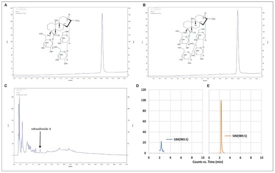 RP-HPLC chromatograms of the stevioside (A), rebaudioside A (B) standards, and steviol glycosides fraction extract from the SRS89 strain of Pantoea vagans (C). Single ion [M+Na]+ monitoring (SIM) chromatogram of bacteria sample (D) and pure rebaudioside A standard (E) separated in HILIC mode.