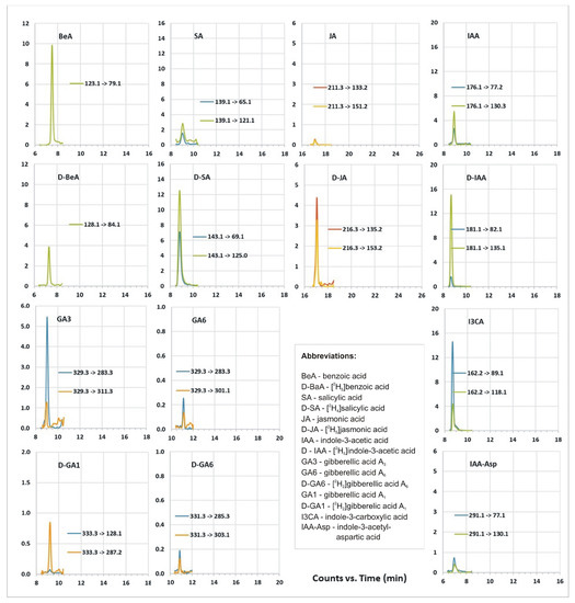 MRM parameters at positive ion mode (+ESI), capillary voltage 4 kV, gas temperature 350 °C, gas flow 12 L/min and nebulizer pressure 35 psi. MassHunter software was used to control the LC–MS/MS system and in data analysis. For MRM parameters optimization MassHunter Optimizer was used. Monitored compounds: [2H5]benzoic acid (D-BeA), benzoic acid (BeA), [2H4]salicylic acid (D-SA), salicylic acid (SA), [2H5]jasmonic acid (D-JA), jasmonic acid (JA), [2H5]indole-3-acetic acid (D-IAA) indole-3-acetic acid (IAA), indole-3-carboxylic acid (I3CA), indole-3-acetyl-aspartic acid (IAA-Asp), gibberellic acid A3 (GA3), [2H2]gibberellic acid A1 (D-GA1), [2H2]gibberellic acid A6 (D-GA6), gibberellic acid A6 (GA6).