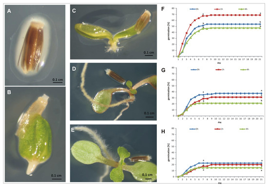 The effect of SRS89 strain on stevia seed germination. Seeds were surface sterilized and inoculated with the isolated Pantoea vagans strain for one or four hours. Non inoculated seeds were used as a control. The following stages of stevia seed germination after inoculation with SRS89 strain (A–E). The stevia seed germination on agar gel (F), agar gel supplemented with 50 mM NaCl (G) or with 150 mM NaCl (H). The values of seed germination are means of four replications (n = 4). Different letters indicate a significant difference in the percentage of germinated seeds at the 7th (germination energy, GE) and 21st (germination capacity, GC) day of incubation at p < 0.05 according to Duncan’s test.