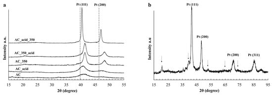 The X-ray diffraction patterns of the obtained PtCu/C samples (a); the X-ray diffraction pattern of the AC_350 sample (b) indicating the localization of the PtCu intermetallic structure.