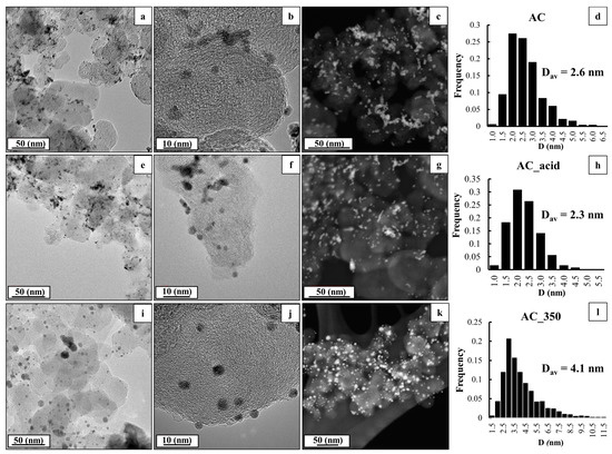 The TEM and STEM results for the AC, AC_acid, and AC_350 materials (Figure 2) exhibit a uniform distribution of NPs over the carbon support surface with a small proportion of agglomerates. The obtained AC sample is characterized by a narrow size dispersion (Figure 2d) and an average size of NPs equal to 2.6 nm, which correlates well with the average crystallite size based on the XRD data (Table 1). The acid treatment results in virtually no changes in the average size of NPs and the nature of their size distribution (within the margin of error) (Figure 2h), which is compliant with the XRD data. At the same time, the thermal treatment results in a significant increase in the average size of NPs from 2.6 to 4.1 nm according to the TEM results. This enlargement is accompanied by a change in the nature of the NPs’ size distribution due to an increase in the proportion of larger particles and a decrease in the proportion of smaller NPs (Figure 2l). This fact is compliant with the enlargement of the crystallite size based on the XRD data, although the size of particles according to the TEM results proved to be smaller than the average crystallite size determined with regard to the XRD results. This appears to be connected with the features of determining the average size of NPs by TEM due to the presence of agglomerates, the contribution of which was not taken into account [40].