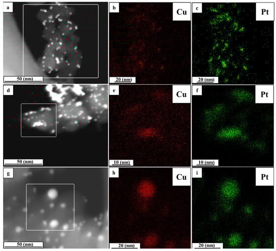 According to the results of the elemental mapping (Figure 3), atoms of copper and platinum are localized at the same sections, which confirms the formation of bimetallic PtCu NPs. The samples’ local composition, determined based on the results of the elemental mapping, as well as their total composition, determined by TXRF analysis, coincide with the material in the as-prepared state (PtCu1.26). However, there are some variances for the materials obtained after the thermal treatment and acid treatment. The proportion of copper in individual NPs increases for the AC_350 sample (the obtained composition is PtCu1.86), which is not compliant with the TXRF results (the obtained composition is PtCu1.26). According to the TEM results, the content of copper decreases after the acid treatment (the obtained composition is PtCu0.46) but to a lesser extent than as revealed by TXRF analysis (the obtained composition is PtCu0.29). Therefore, the results of the elemental analysis and the local microanalysis by TEM demonstrate the same trends of change in the composition. However, in some instances, they differ in absolute values due to the features of the methods used.