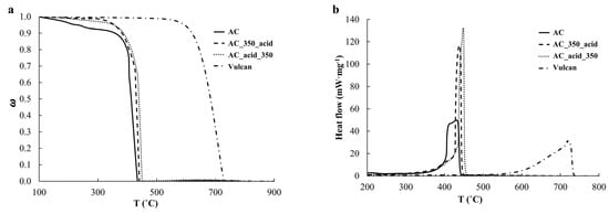 To study the features of the high-temperature oxidation of the obtained AC, AC_350_acid, and AC_acid_350 materials, TGA was conducted. The intense oxidation of the AC sample in the as-prepared state is revealed to proceed at lower temperatures compared with the AC_350_acid and AC_acid_350 samples and the Vulcan carbon support (Figure 4a). The nature of the combustion of these samples also differs. For example, the untreated material burns in a wider range of temperatures than the materials obtained after various pretreatment types (Figure 4b) [42,43]. The combustion of the Vulcan carbon support occurs at higher temperatures and a wider range of temperatures compared with the PtCu/C catalysts.