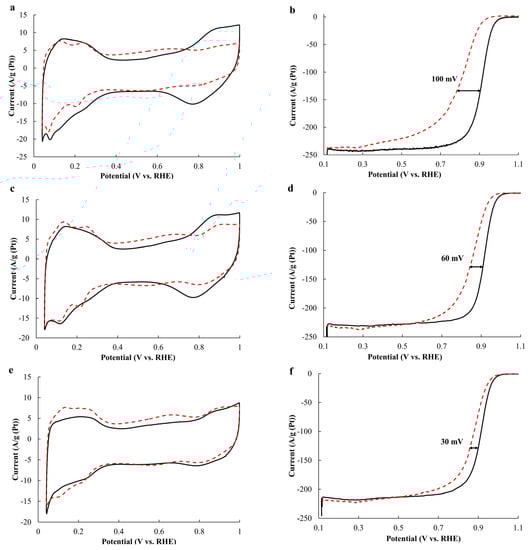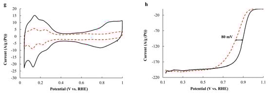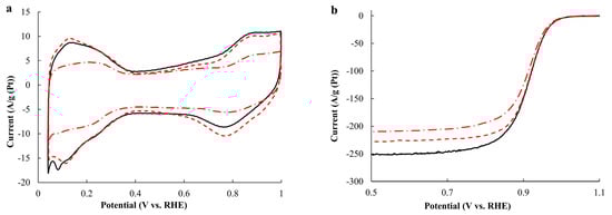 The durability of the catalysts was determined by the stress testing method, i.e., repeated (2000 cycles of the CV) cycling at the rate of a potential sweep of 100 mV/s in a potential range of 0.6–1.4 V in a 0.1 M HClO4 solution saturated with Ar, as described in the reference [40].