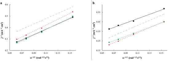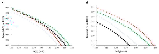 The values of kinetic currents and the number of electrons of the cell reaction before and after stress testing were determined according to the Koutetsky−Levich equation (Figure 7a,b). It should be noted that the values of kinetic currents decrease significantly after stress testing due to the degradation processes. Taking into account degradation, the number of electrons (n) after durability testing was determined at 0.80 V. The analysis of the slope of the Koutetsky−Levich dependences (Figure 7a,b) before and after durability testing shows that the slope angle for different materials before and after stress testing is similar. The calculation of the number of electrons for the materials after stress testing also shows values of about 3.6–3.9, which is close to the four-electron mechanism of the reaction. The number of electrons of less than four may testify to the contribution of the concurrent two-electron reaction with the formation of hydrogen peroxide [47].
