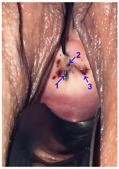 Localization of endometriotic lesions on the cervix during speculum exam. Foci of ectopic endometrium, up to 2 mm in size: 1—at 7 o’clock of the conditional dial, 2—in the area of the external os of the cervix, 3—the formation of a purple color at 5 o’clock of the conditional dial. The patient gave informed consent to the photographic recording and publication of the photograph.