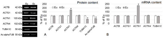 The relative content of actin isoforms (beta- and gamma-), actin-binding protein alpha-actinin-4, as well as the mRNA of the corresponding genes, did not differ in biopsies of the eutopic and ectopic endometrium (Figure 2). The content of alpha-actinin-1 in the focus of endometriosis was 75% (p < 0.05) (Figure 2A) and the mRNA encoding its gene was higher by 130% (p < 0.05) (Figure 2B) than in the eutopic endometrium. The content of alpha-tubulin and acetylated alpha-tubulin was reduced in the ectopic endometrium by 45% (p < 0.05) and 37% (p < 0.05), respectively, although the mRNA level did not differ from the norm.