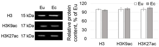 The relative content of histone H3, as well as its isoforms acetylated at 9 and 27 lysine (H3K9ac and H3K27ac) did not differ in the biopsy specimens of the eutopic and ectopic endometrium (Figure 3).
