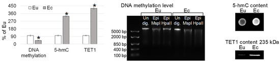 The epigenetic events in the eutopic and ectopic endometrium: total DNA methylation level, the relative content of 5-hmC and active demethylase TET1 (tet methylcytosine dioxygenase 1) with typical pictures. Eu—eutopic endometrium. Ec—ectopic endometrium. Undig.—undigested DNA. Epi MspI—digested with Epi MspI. Epi HpaII—digested with Epi HpaII. Western-blotting and restriction analysis were performed twice, dot-blotting—thrice. *—p < 0.05 in comparison with norm Eu.