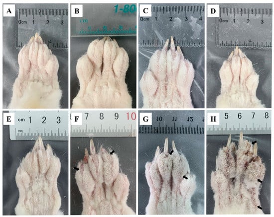 The toes of the infested rabbits displayed swelling at 6 hpi (Figure 1B) and faded away by 12 hpi (Figure 1C) compared to the control group (Figure 1A). From 1 dpi to 3 dpi, no abnormal ocular changes were observed on the toes (Figure 1D,E). At 1 wpi, some crust appeared on the end of the toes (Figure 1F, arrows). The crust became thicker and spread to the entire toes after 4 wpi (Figure 1G, arrows). At 8 wpi, the toes were covered with a thick layer of crust (Figure 1H, arrows), and the obvious crust was also observed on the rabbits’ noses, mouths, and ear edges. After the artificial infestation, the rabbits presented with itching activities, such as shaking legs and biting feet. These activities became more intense with an increase in infestation time.