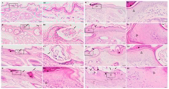 Pathological changes in the posterior toe skin in rabbits. (A) control, (B) 6 hpi, (C) 12 hpi, (D) 1 dpi, (E) 3 dpi, (F) 1 wpi, (G) 4 wpi, (H) 8 wpi. The black dotted line in figures (A–H) indicates the epidermis–dermis junction. Figures (A1–H1) (scale bar = 20 μm) represent the enlarged figure of the black frame in figures (A–H) (scale bar = 100 μm). The arrows point to the S. scabiei, the solid triangles point to the scab, the hollow triangles point to hyperkeratosis, and the rhombuses point to congestion and hemorrhaging.