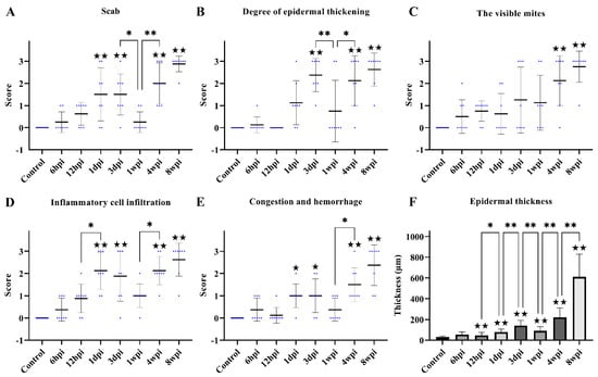Scoring of pathological changes. (A) Scab, (B) degree of epidermal thickening, (C) the visible mites, (D) inflammatory cell infiltration, (E) congestion and hemorrhage, and (F) epidermal thickness. (A–E) shows the score of skin pathological changes according to the Table 1, blue dots represent the number of rabbits, and the black line represent the average score. (F) shows epidermal thickness measured by Image-Pro Plus 5.1 software, randomly measuring at least 30 widths of each H&E-stained skin section along the epidermis. Data were represented as the mean ± standard deviation. (M ± SD). The horizontal line indicates a significant adjacent pairwise group difference (* p < 0.05 and ** p < 0.01). ★ on the bar represents a significant difference between the specific experimental group and the control group (★ p < 0.05 and ★★ p < 0.01).