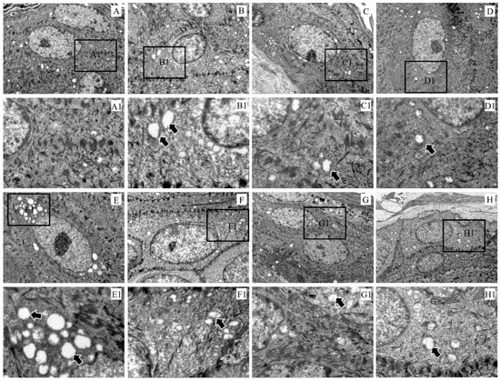 Ultramicropathology of the epidermis of rabbit skin. (A) Control, (B) 6 hpi, (C) 12 hpi, (D) 1 dpi, (E) 3 dpi, (F) 1 wpi, (G) 4 wpi, (H) 8 wpi. Figures (A1–H1) (×3000) represent the enlarged figure of the black frame in figures (A–H) (×8000). The arrows point to mitochondrial swelling.