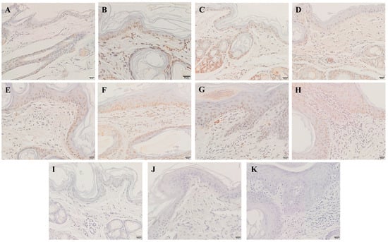 TUNEL staining for the apoptosis of skin cells. (A) TUNEL staining of the skin before artificial infestation (control). (B–H) TUNEL staining for skin artificially infested for 6 h, 12 h, 1 d, 3 d, 1 w, 4 w, and 8 w. (I–K) Negative control. Brownish-yellow nuclei cells are the TUNEL-positive cells. Scale bar = 20 μm.