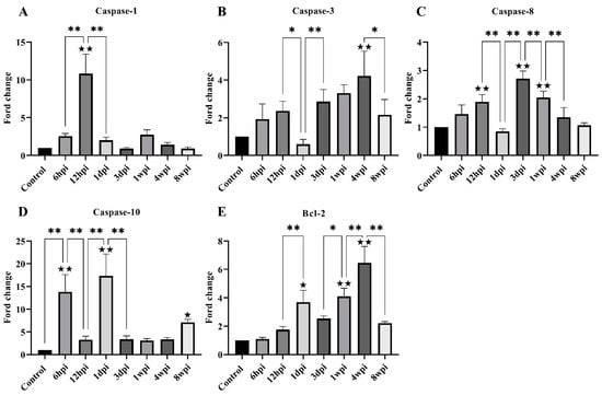 For genes associated with apoptosis, the level of caspase-1, caspase-3, caspase-8, caspase-10, and Bcl-2 expression was investigated. The level of caspase-1 mRNA expression was found to be significantly increased at 12 hpi, and then significantly decreased at 1 dpi (Figure 6A). The overall caspase-3 and caspase-8 mRNA levels increased parabolically along with the infestation time but significantly decreased at 1 dpi and 8 wpi (Figure 6B,C). The level of caspase-10 mRNA was significantly increased at 6 hpi, 1 dpi, and 8 wpi compared with the control group (Figure 6D). The level of Bcl-2 mRNA expression was significantly increased at 1 dpi, 1 wpi, and 4 wpi compared with the control group (Figure 6E).