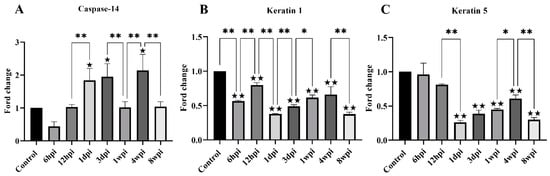 For genes associated with keratinization, the level of keratin-1, keratin-5, and caspase-14 mRNA expression was studied. The level of caspase-14 mRNA was significantly increased at 1 dpi, 3 dpi, and 4 wpi compared with the control group (Figure 7A). Overall, the level of keratin-1 mRNA expression was significantly decreased compared with the control group, with slight fluctuations between the experimental groups (Figure 7B). The level of keratin-5 mRNA expression began to decrease due to artificial infestation and was significantly decreased at 1 dpi compared with the control group (Figure 7C).