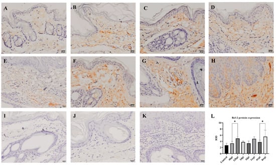 Skin paraffin sections were produced in the same way shown in the pathological observation. Immunohistochemistry was performed as previously described [28]. Briefly, skin paraffin sections were dewaxed in xylene and rehydrated in graded ethanol. After being washed with PBS, the sections were covered by 3% H2O2 for 10 min, blocked with 5% goat serum at room temperature for 20 min, and incubated with 50 μL rabbit anti-Bcl-2 antibody (Boster, Wuhan, China, 1:400 dilution) for 20 h at 4 °C, followed by 50 μL HRP conjugated goat anti-rabbit (Boster, Wuhan, China, 1:1500 dilution) for 1 h at 37 °C. Finally, the sections were treated with Enhanced HRP-DAB Chromogenic Substrate Kit (Tiangen, Beijing, China), stained with hematoxylin, rehydrated in graded ethanol and xylene, and mounted. The primary antibody was replaced with PBS as a negative control experiment, and the remaining experimental steps were the same as above. The skin tissue sections were observed and photographed using the slide scanner Olympus VS120 (Olympus, Japan). IOD determined the expression level of Bcl-2 protein in each group. For each section, five fields (scale bar = 20 μm) from each area of the image were analyzed using Image-Pro Plus 5.1 software (Media Cybernetics, Bethesda, MD, USA) [63].