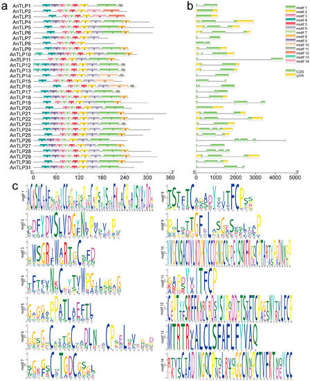 We also conducted MEME analysis to identify the protein motif in amino acid sequences of AnTLPs. The majority of the AnTLP proteins contained motif1, motif 2, motif 3, motif 4, motif 5, motif 6, motif 7, motif 8, and motif 9, indicating that these motifs were the core sequences of the conserved domain of the AnTLPs. Some motifs were only detected in one or two AnTLPs. For example, motif 12 and motif 14 were only present in AnTLP2 and AnTLP3 (Figure 3a). All AnTLP loci ranged in length from 591 bp to 1047 bp, with the longest gene being AnTLP21 and the shortest being AnTLP7. Most AnTLP (28/31, 90.32%) loci contain less than three introns, and 14 AnTLP loci have only one or zero intron (Figure 3b).
