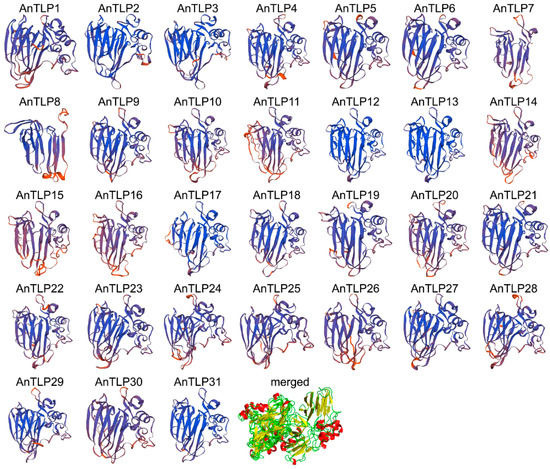 Predicted three-dimensional structures of AnTLPs. The three-dimensional structure prediction was performed in the SWISS-MODEL database. Multiple protein models were combined using PyMol software.