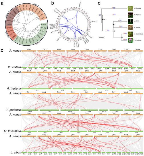 Phylogenetics, gene duplication and divergence of AnTLP genes. (a) The phylogenetic tree of AnTLP family. Different colors represented different cluster. (b) The distribution of segmental duplication genes of AnTLP on the chromosome of A. nanus. (c) Homologous gene pairs between A. nanus and V. vinifera, A. thaliana, M. truncatula, T. pratense, and L. albus, respectively, and the red lines indicate AnTLPs. (d) Evolution of TLP gene family in A. nanus and five relative species. Black numbers represent the time of species differentiation, red numbers represent the number of orthologous genes of AnTLP lost or increased during evolution, and blue numbers represent the number of orthologous genes in AnTLP genes. The gene names represented by red and blue numbers are listed in Table S2. The pictures of A. nanus, V. vinifera, A. thaliana, M. truncatula, T. pratense, and L. albus were obtained from the Plant Photo Bank of China (PPBC).