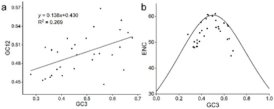 The correlation analysis of GC3, GC12, and ENC in A. nanus. (a) The correlation analysis of GC3 and GC12. (b) The correlation analysis of GC3 and ENC.