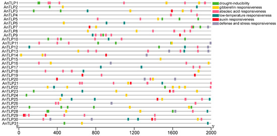 Distribution of the predicted cis-acting elements that were involved in abiotic stress response and hormone response in the promoter region of the AnTLP genes in A. nanus. Different color blocks represent different types of cis-acting elements. The position of the cis-acting element in the promoter region can be estimated by the scale at the bottom.