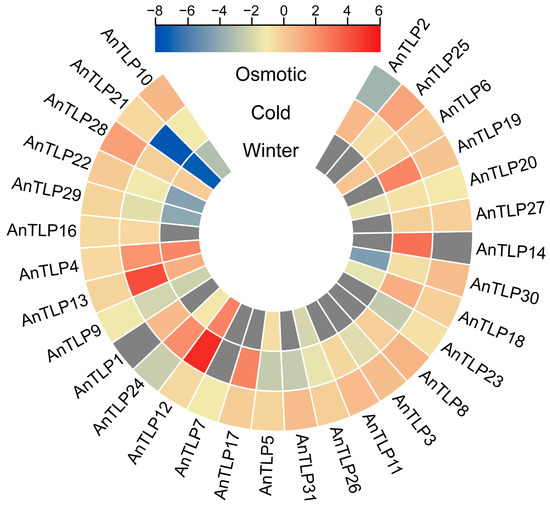 To further evaluate the potential functions of AnTLP genes, especially their roles in osmotic and low-temperature stress responses, the expression patterns of TLP family genes were analyzed using the RNA-seq database and qRT-PCR analysis. The transcriptome data showed that three AnTLP, i.e., AnTLP4, AnTLP12, and AnTLP13, were highly expressed in winter, and more AnTLP genes were up-regulated under short-term cold stress, including the three highly expressed genes in winter (Figure 8). The transcriptome data revealed that AnTLP25 and AnTLP28 were highly expressed under short-term osmotic stress.