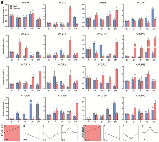 To further investigate the temporal expression pattern of the AnTLP, qRT-PCR analyses were performed for 16 AnTLP genes (Figure 9a). By series test of cluster analysis, AnTLP genes can be classified into four categories based on expression patterns under cold stress and osmotic stress (Figure 9b,c). Under cold stress, the expression levels of eight AnTLP genes increased gradually, including AnTLP24 and AnTLP29, while the expression of five AnTLP genes decreased gradually, including AnTLP16 and AnTLP22. Under osmotic stress, the expression of 12 AnTLP genes increased gradually, including AnTLP14 and AnTLP29, and the expression levels of two other AnTLP genes decreased gradually, including AnTLP1 and AnTLP7.