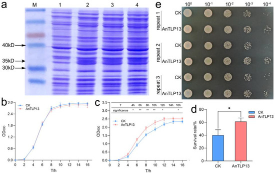 Overexpression of the AnTLP13 gene enhanced the tolerance to low temperature in E. coli and yeast. (a) Gel electrophoresis of AnTLP13. M in the figure represents the protein marker, and 1 represents the CK group, 2–4 represent the AnTLP13 group. (b) Growth curves of E. coli under normal conditions (37 °C). (c) Growth curves of E. coli under low-temperature stress (28 °C). (d) Survival rate of E. coli under repeated freeze–thaw stress. * and ** indicate p < 0.05 and p < 0.01, respectively. (e) Overexpression of the AnTLP13 gene enhanced the tolerance to repeated freeze–thaw stress in yeast.