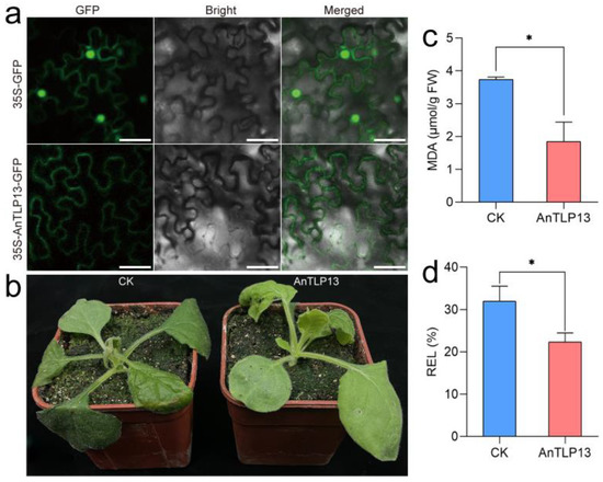 Tobacco transient transformation assay was used to evaluate the protective effect of AnTLP13 on tobacco cells under freezing stress. The tobacco transformed with pCAMBIA1300 empty plasmid was recorded as the CK group, and the tobacco transformed with AnTLP13 was recorded as the AnTLP13 group. Subcellular localization analysis showed that AnTLP13 protein was localized in the apoplast of plant cells (Figure 11a). After tobacco was cultured at −4 °C for 12 h, tobacco seedlings in CK and AnTLP13 groups wilted, but the wilting degree of plants in the AnTLP13 group was relatively low (Figure 11b). MDA and REL are important indicators to evaluate the damage to cell membranes caused by stress conditions, and the MDA content and REL values in the AnTLP13 group were significantly lower than those in the CK group (Figure 11c,d). These data indicate that the expression of the AnTLP13 gene enhanced the tolerance of tobacco seedlings to freezing stress.
