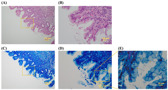 Histopathological observation of biopsy specimen. The gastric mucosa stained with HE (A,B) and Giemsa (C–E) of patient no. 15. The original magnification is ×10. (B,D) Higher magnification of the area indicated by the squares in (A,C), respectively. (E) High-magnification image of the box in (D). Spiral-like and seagull-like bacilli can be confirmed in the mucus (white arrowhead) and the interior of mucous cells (yellow arrowhead) of the stomach.