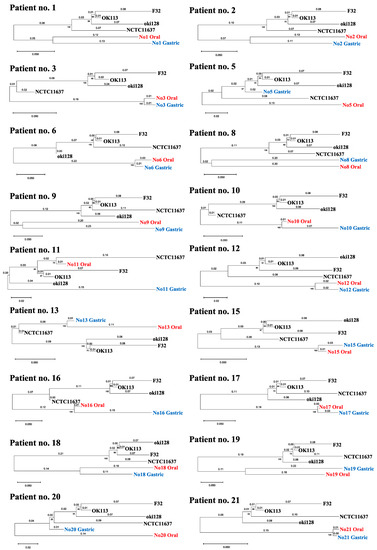 Phylogenetic trees were created using the samples that obtained a combination of two or more alleles (Figure 2). There was a large sequence of diversity between strains of oral and gastric origin in most samples. On the other hand, the oral-derived H. pylori strains in patients no. 3, 6, 12, 15, 17 and 21 had markedly similar sequences to their respective counterpart gastric-derived strains, revealing that evolution distances were 0.03 or less, with bootstrap values of 100. These data imply the possibility that oral and gastric H. pylori are related in a small number of patients. Partial sequences per patient are demonstrated in the Supplementary Materials (File S1).