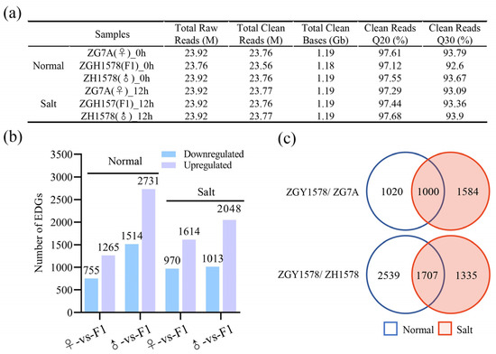 DEGs between hybrid ZGY1578 and its parents ZG7A and ZH1578. The roots of 21 days’ seedling under normal (H2O) and salt stress (120 mM NaCl for 12 h) conditions were harvested for RNA-Seq. (a) Summary data of RNA-Seq. (b) Up- and downregulated DEGs with at least twofold change. (c) Comparison of DEGs between normal and salt stress conditions.