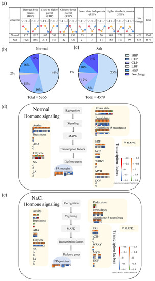 According to the gene expression levels in the hybrid relative to its parents, the DEGs were classified into five groups, including between both parents (BBP), close to the higher parent (CHP), close to the lower parent (CLP), lower than both parents (LBP), and higher than both parents (HBP) (Figure 3a). We observed that 46%, 10%, 18%, 2%, and 16% of DEGs were classified into BBP, CHP, CLP, LBP, and HBP under normal conditions (Figure 3b), respectively, and 55%, 8%, 12%, 1%, and 10% of DEGs were classified into BBP, CHP, CLP, LBP, and HBP under salt stress (Figure 3c). Hybridization can activate or inhibit the expression of certain genes in hybrids, which might provide valuable clues to elucidate the formation of heterosis. Thus, the DEGs belonging to LBP and HBP were used for further MapMan analysis. It showed that these DEGs were mainly associated with the transcription factors, hormone-, and ROS-related genes under both normal and salt stress conditions (Figure 3d,e; Supplementary Table S2). These DEGs associated with the transcription factors, hormone-, and ROS-related genes were focused on the following investigation.