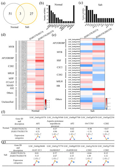 As mentioned above, a total of 54 and 30 DEGs associated with transcription factors were identified under normal and salt stress conditions, respectively, between hybrid ZGY1578 and its parents (Figure 4a). Of them, only 3 DEGs were identified under both conditions, while 27 DEGs were specifically identified under salt stress. The top 3 DEGs belonged to the MYB, AP2/EREBP, and C2H2 transcription factors under normal conditions (Figure 4b), while the top 4 DEGs belonged to the MYB, HSF, C2C2, and C2H2 transcription factors under salt stress (Figure 4c). Generally, the higher change values of gene expression in DEGs were observed between ZGY1578 and ZGH1578 compared with those of DEGs between ZGY1578 and ZG75A under both normal and salt stress conditions (Figure 4d,e). Of them, the top 5 changed DEGs were LOC_Os01g10370, LOC_Os10g39360, LOC_Os08g07700, LOC_Os02g05470, and LOC_Os03g62230 under normal condition (Figure 4f). The top 5 changed DEGs were LOC_Os04g58680, LOC_Os01g73770, LOC_Os08g05520, LOC_Os01g70150, and LOC_Os05g37190 under salt stress (Figure 4g). By comparison, the majority of these DEGs were highly expressed in the hybrid ZGY1578 compared with its parents. The induced DEGs in hybrid ZGY1578 might play important roles in the heterosis of salt tolerance.