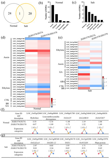 As mentioned above, a total of 25 and 21 DEGs associated with hormone-related genes were identified under normal and salt stress conditions, respectively, between hybrid ZGY1578 and its parents (Figure 5a). Of them, only 1 DEG was identified under both conditions, while 20 DEGs were specifically expressed under salt stress. The top 3 DEGs were auxin-, ethylene-, and cytokinin (CTK)-related genes under normal conditions (Figure 5b), while the top 3 DEGs were ethylene-, auxin-, and gibberellin-related genes under salt stress (Figure 5c). Generally, the higher change values of the gene expression in DEGs were observed between ZGY1578 and ZGH1578 compared with those of DEGs between ZGY1578 and ZG75A under normal conditions (Figure 5d). However, opposite results were observed that the higher change values of the gene expression in DEGs existed between ZGY1578 and ZG75A under salt stress (Figure 5e). Of them, the top 5 changed DEGs were LOC_Os03g62060, LOC_Os06g08060, LOC_Os08g01780, LOC_Os09g24840, and LOC_Os06g48850 under normal conditions (Figure 5f). The top 5 changed DEGs were LOC_Os05g43880, LOC_Os11g08340, LOC_Os03g58170, LOC_Os12g42280, and LOC_Os09g12970 under salt stress (Figure 5g). By comparison, the majority of these DEGs were highly expressed in the hybrid ZGY1578 compared with its parents. The induced DEGs in hybrid ZGY1578 might play important roles in the heterosis of salt tolerance.