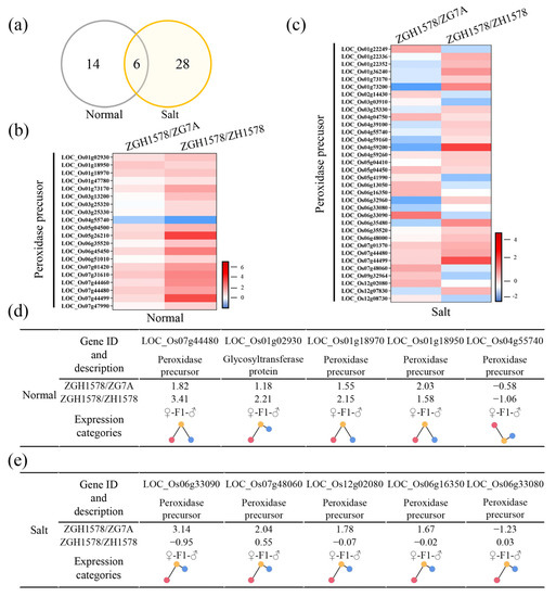 As mentioned above, a total of 20 and 34 DEGs associated with ROS-related genes were identified under normal and salt stress conditions, respectively, between hybrid ZGY1578 and its parents (Figure 6a). Of them, only 6 DEGs were identified under both normal and salt stress conditions, while 28 DEGs were specifically expressed under salt stress. Generally, higher change values of the gene expression in DEGs were observed between ZGY1578 and ZGH1578 compared with those of DEGs between ZGY1578 and ZG75A under normal conditions (Figure 6b). However, opposite results were observed that higher change values of the gene expression in DEGs existed between ZGY1578 and ZG75A under salt stress (Figure 6c). Of them, the top 5 changed DEGs were LOC_Os07g44480, LOC_Os01g02930, LOC_Os01g18970, LOC_Os01g18950, and LOC_Os04g55740 under normal conditions (Figure 6d). The top 5 changed DEGs were LOC_Os06g33090, LOC_Os07g48060, LOC_Os12g02080, LOC_Os06g16350, and LOC_Os06g33080 under salt stress (Figure 6e). By comparison, the majority of these DEGs were highly expressed in hybrid ZGY1578 compared with its parents. The induced DEGs in hybrid ZGY1578 might play important roles in the heterosis of salt tolerance.