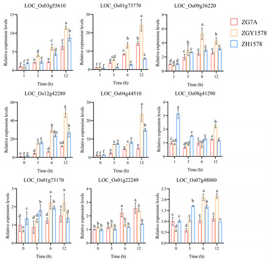 Relative expression levels of the randomly selected DEGs detected using real-time quantitative PCR. The OsActin gene was used as the internal control. Data are means (±SD), n = 3. The different letters indicate the significant differences determined using ANOVA test: p < 0.05.