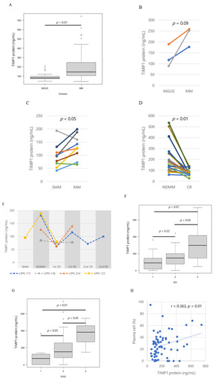 Tissue inhibitor of metalloproteinase 1 (TIMP1) protein levels. (A) Box plot of TIMP1 protein levels in controls, patients with monoclonal gammopathy of undetermined significance (MGUS), and patients with multiple myeloma (MM). Pairwise comparisons of TIMP1 protein levels in patients with different disease statuses. (B) MGUS and MM, (C) smouldering myeloma (SMM) and MM, and (D) MM at newly diagnosis (NDMM) and at complete response (CR). (E) TIMP1 protein levels in corresponding patients with different disease statuses; SMM, NDMM, CR, progressive disease (PD). Different colors of lines indicate corresponding patients. (F) Box plot of TIMP1 protein levels by international staging system (ISS) stage. (G) Box plot of TIMP1 protein levels by Revised ISS stage. (H) Correlation between TIMP1 concentrations in bone marrow plasma and plasma cell percentage in bone marrow in patients. Each dot represents an individual patient. The dotted line is the least square line.