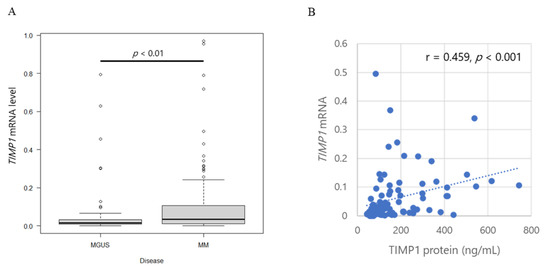We examined TIMP1 protein concentrations in BM plasma from patients with MGUS and MM. TIMP1 protein concentrations were significantly larger in BM plasma from patients with MM than in that from patients with MGUS (p < 0.001; Figure 1A).