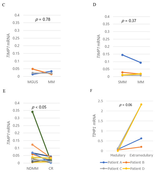 TIMP1 mRNA levels increased in two patients but decreased in one patient, although protein levels increased with progression from MGUS to MM in all three patients (Figure 2C). TIMP1 mRNA levels in myeloma cells did not differ in pairwise analysis of the corresponding patients as the disease progressed from SMM to MM (Figure 2D). Notably, however, TIMP1 mRNA levels decreased significantly from diagnosis to CR (p = 0.049), similar to TIMP1 protein levels in the corresponding patients (Figure 2E). Since the flow cytometric analysis at CR exhibited no abnormal clonal plasma cells in the BM, this result supports the idea that myeloma cells produce higher amounts of TIMP1. TIMP1 mRNA levels are also markedly higher in extramedullary plasmacytoma than in BM plasma cell in corresponding patients (Figure 2F).