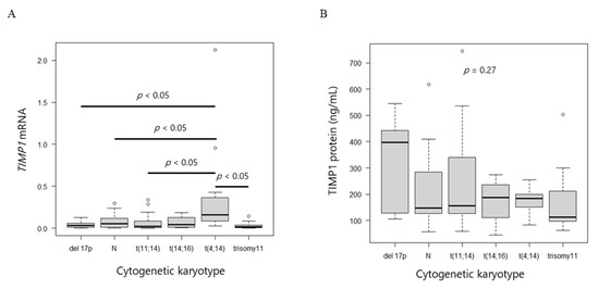 TIMP1 mRNA and protein levels. (A) Box plot of TIMP1 mRNA levels and (B) TIMP1 protein levels among different cytogenetic abnormalities.