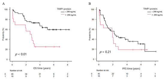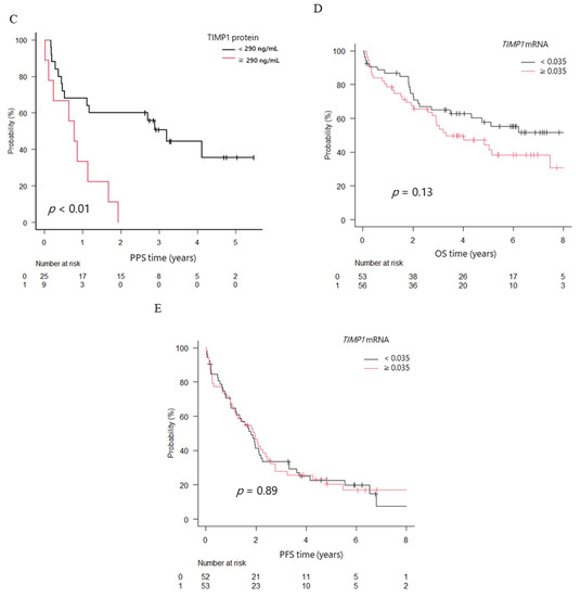 To clarify clinical significance of TIMP1, we analyzed patients’ survival according to TIMP1 protein and mRNA expression levels. The overall survival (OS) in the high TIMP1 protein group was 2.7 years, whereas that in the low group was not reached; the difference was significant (p < 0.01). On the other hand, progression-free survival (PFS) did not differ between the groups (1.9 years in the high group and 2.3 years in the low group, p = 0.21). Post-progression survival (PPS) was shorter (0.8 years in the high group and 2.9 years in the low group, p < 0.01; Figure 4A–C).