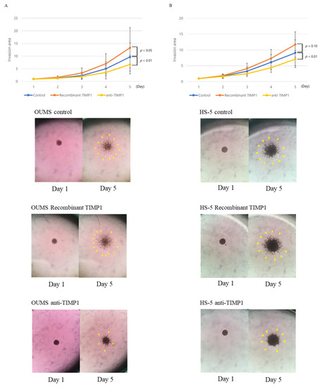 Fibroblast invasive capacity. Three-dimensional matrix invasion assays were used to evaluate the invasive capacity of (A) OUMS-36T-3F and (B) HS-5 with or without recombinant TIMP1 (0.5 µg/mL) or anti-TIMP1 antibodies (4.0 µg/mL). Blue bar, control; orange bar, recombinant TIMP1; yellow bar, anti-TIMP1 antibodies. Experiments were performed seven times. Error bars show standard deviations (SDs). Representative images of OUMS-36T-3F and HS-5 cells cultured with or without recombinant TIMP1 or anti-TIMP1 antibodies. The yellow arrows point to the spheres.