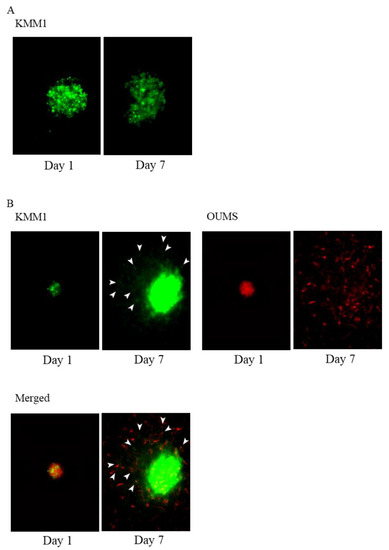 OUMS-36T-3F cells facilitate the invasion of MM cells. (A) Three-dimensional matrix invasion assays of KMM1 MM cells (green color stained with GFP) and (B) KMM1 MM cells (green color stained with GFP) with OUMS-36T-3F fibroblasts (red color stained with m-cherry). White arrows show KMM1 cells (green) migrating after OUMS-36T-3F cells (red).