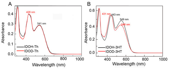 Absorption spectra of (A) IDOH–Th, IDOD–Th, and (B) IDOH–3HT, IDOD–3HT in CH2Cl2.