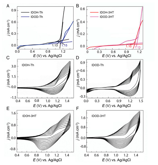 The electrochemical behavior of precursors is examined in CH2Cl2–Bu4NPF6 (0.1 mol L−1). As shown in anodic polarization curves (Figure 2A,B), the onset oxidation potential (Eonset) of IDOH–3HT (1.10 V) is lower than IDOH–Th (1.13 V), IDOD–Th (1.15 V), and IDOD–3HT (1.15 V). Compared with IDOH–Th, IDOD–Th possesses a relatively high onset oxidation potential, mainly attributed to the longer alkyl chains on the lactam rings in the isoindigo structure. The existence of a long alkyl chain creates a greater steric hindrance and enhances the HOMO level of precursors, leading to a rise in onset oxidation potential and polymerization difficulty [30]. Additionally, introducing hexyl side chains on donor moieties can enhance the electron–donating ability and provide a lower onset oxidation potential to create a favorable condition for the electrosynthesis of the precursors [10]. Meanwhile, IDOHE and IDODE (Figure S10), employing a higher electron–donating unit of EDOT as the donor, exhibit lower onset oxidation potentials than the above isoindigo–thiophene D–A–D–type precursors (Table 1). To investigate the electrochemical properties of precursors, we implement cyclic voltammetry (CV) characterization for all precursors. The distinctive difference in cyclic voltammograms (Figure 2C–F) among precursors can be found during the potential scanning process. The redox peak current densities slowly rise during the repeating CV scan, which manifests the growth of a polymer on the electrode. It is noted that the anodic peak shifts to a positive potential and the cathodic peak shifts to a negative potential during the process of polymer deposition. This phenomenon is mainly attributed to the fact that higher overpotential is needed to conquer the increase in resistance caused by the formation of polymer films [28,32]. We further prepare isoindigo–thiophene D–A–D–type polymers by employing the electrosynthesis method to investigate their properties. The polymerization potentials for IDOH–Th, IDOD–Th, IDOH–3HT, and IDOD–3HT are optimized to be 1.30, 1.35, 1.25, and 1.30 V vs. Ag/AgCl, respectively. At these corresponding applied potentials, all isoindigo–thiophene D–A–D–type polymers are electrosynthesized utilizing the chronoamperometry method in CH2Cl2–Bu4NPF6 (0.10 mol L−1) with ITO as the working electrode, Ag/AgCl as the reference electrode, and Pt wires as the counter electrode (Figure S11).